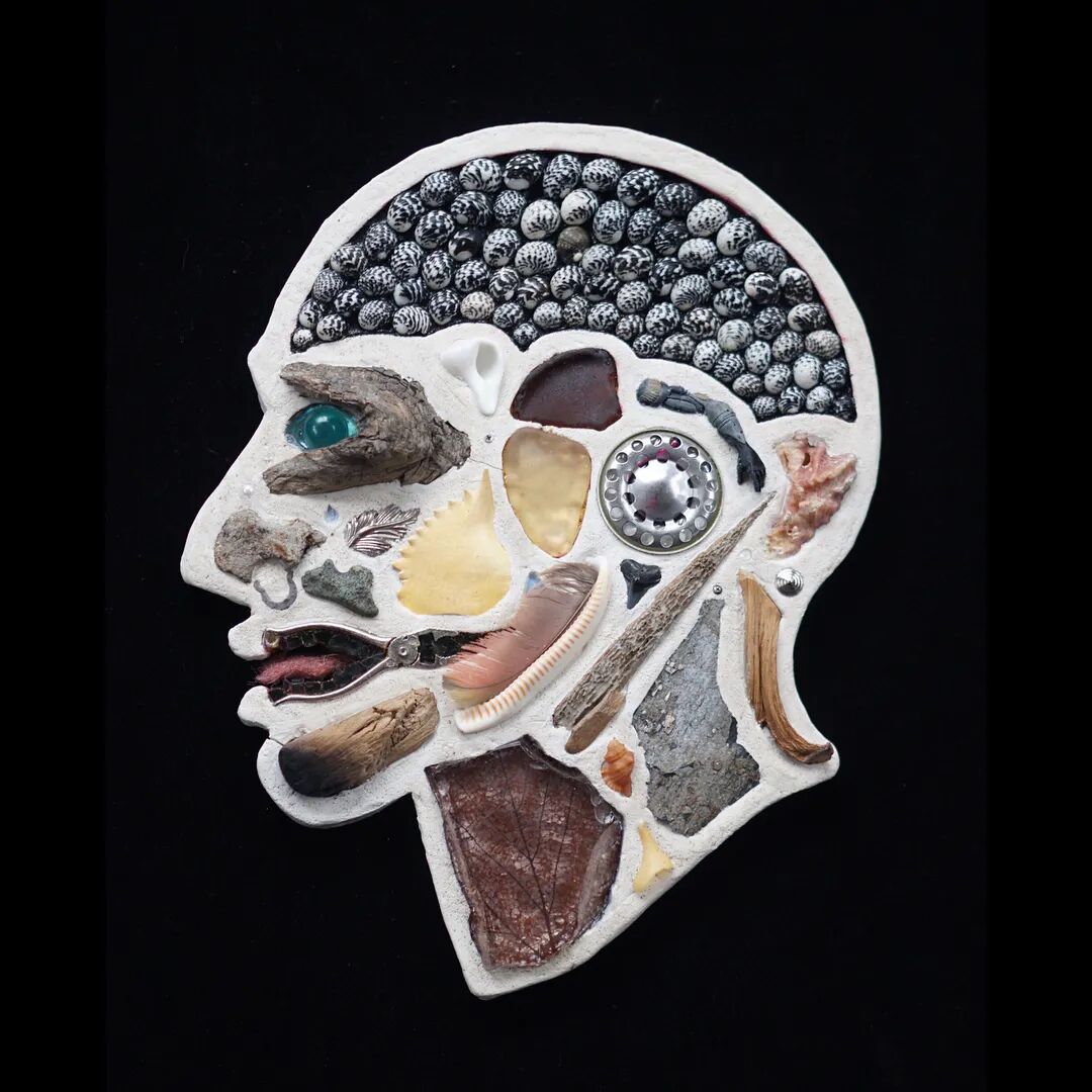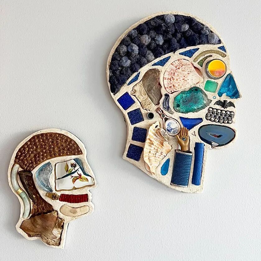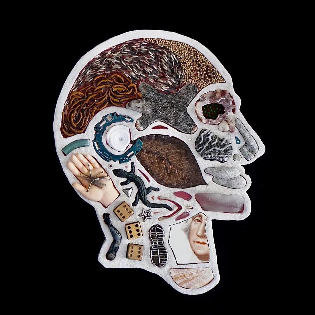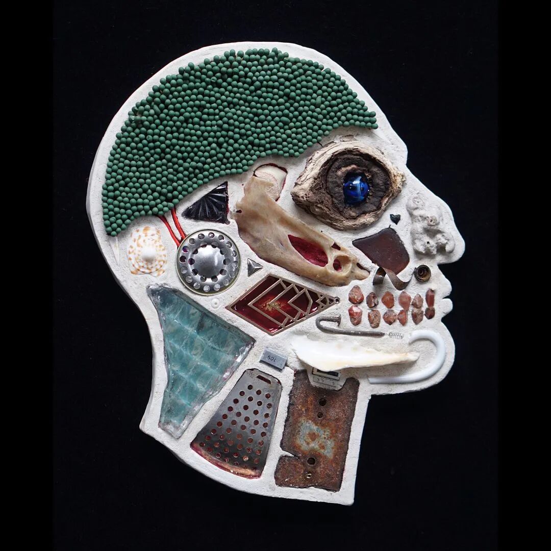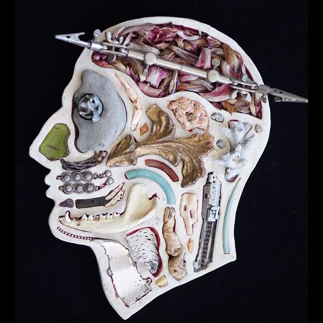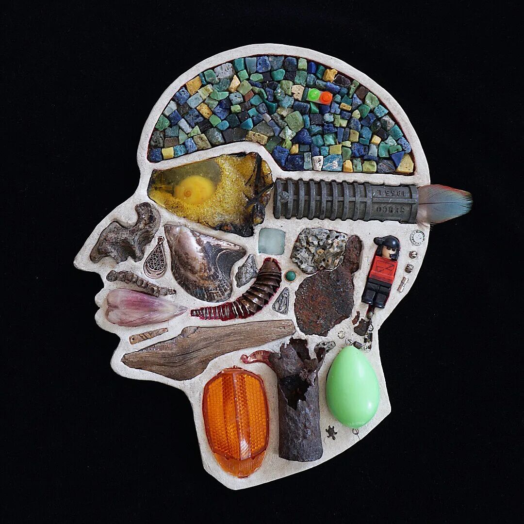 这两位艺术家从事这个系列作品制作已经有10年的时间了,他们用石膏去模仿人类的头骨造型,然后再将这个头骨分割成几个不同区域,最后再使用各类材料去填充这个石膏头骨,最终形成我们看到的《头脑》系列作品。