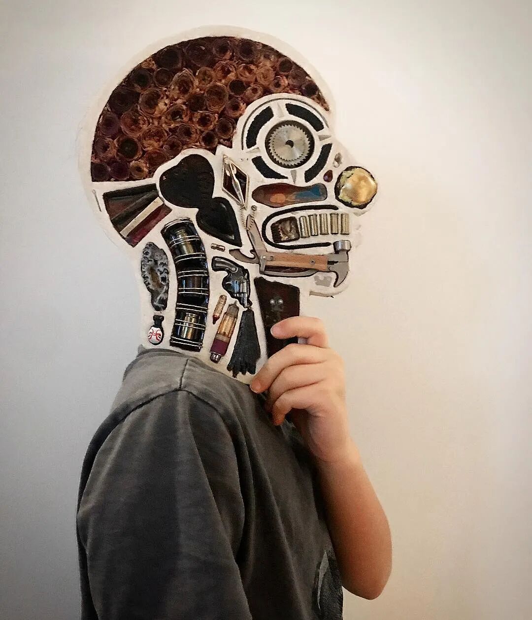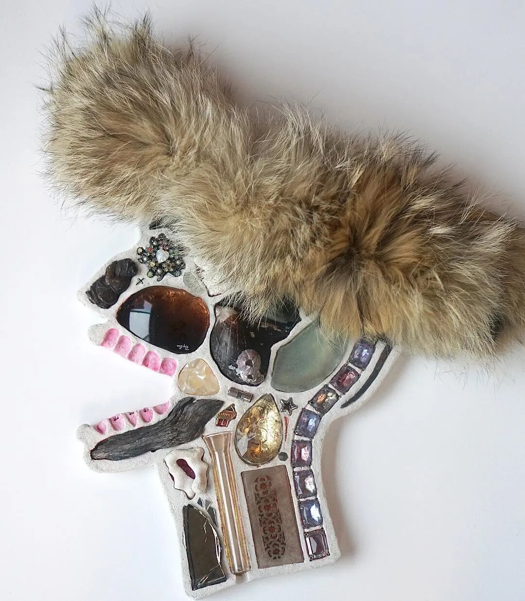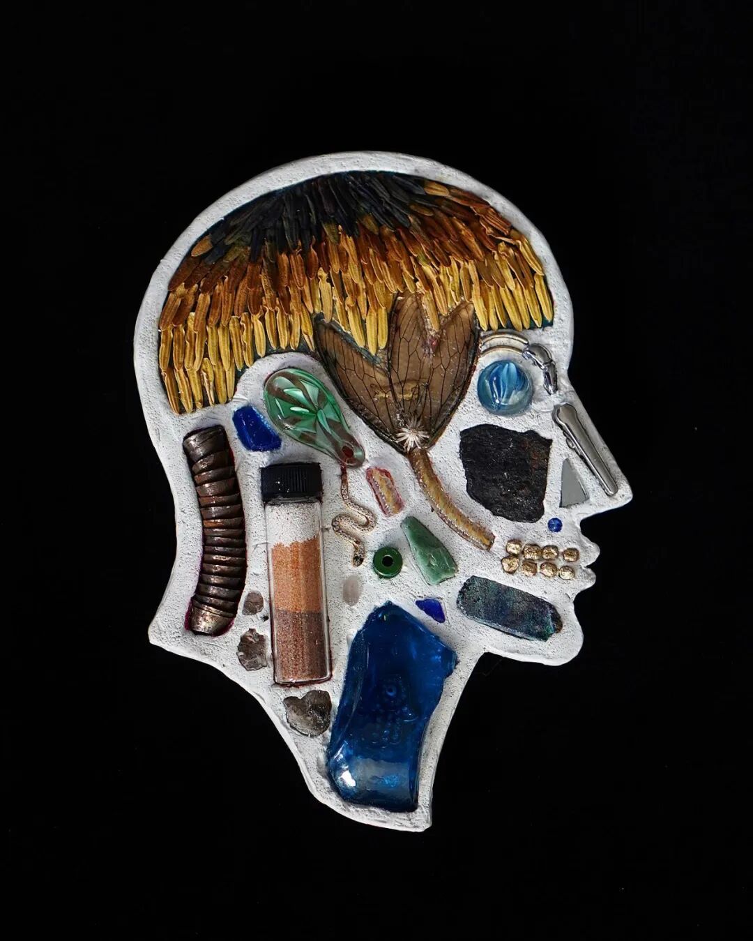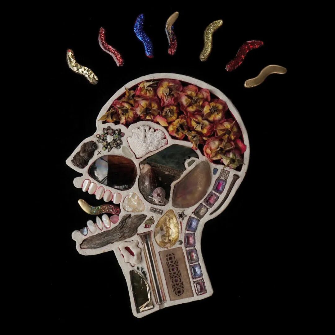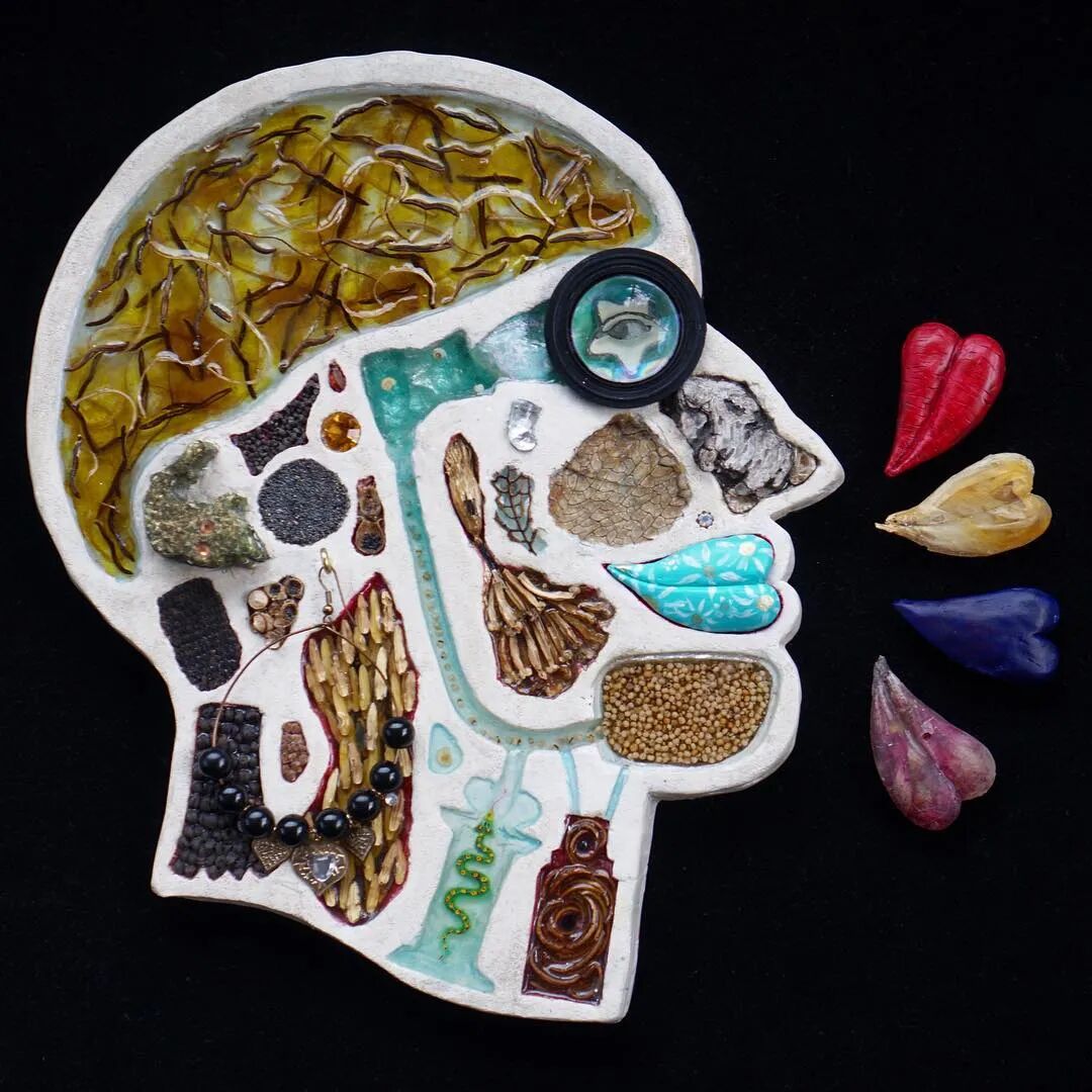这两位艺术家从事这个系列作品制作已经有10年的时间了,他们用石膏去模仿人类的头骨造型,然后再将这个头骨分割成几个不同区域,最后再使用各类材料去填充这个石膏头骨,最终形成我们看到的《头脑》系列作品。