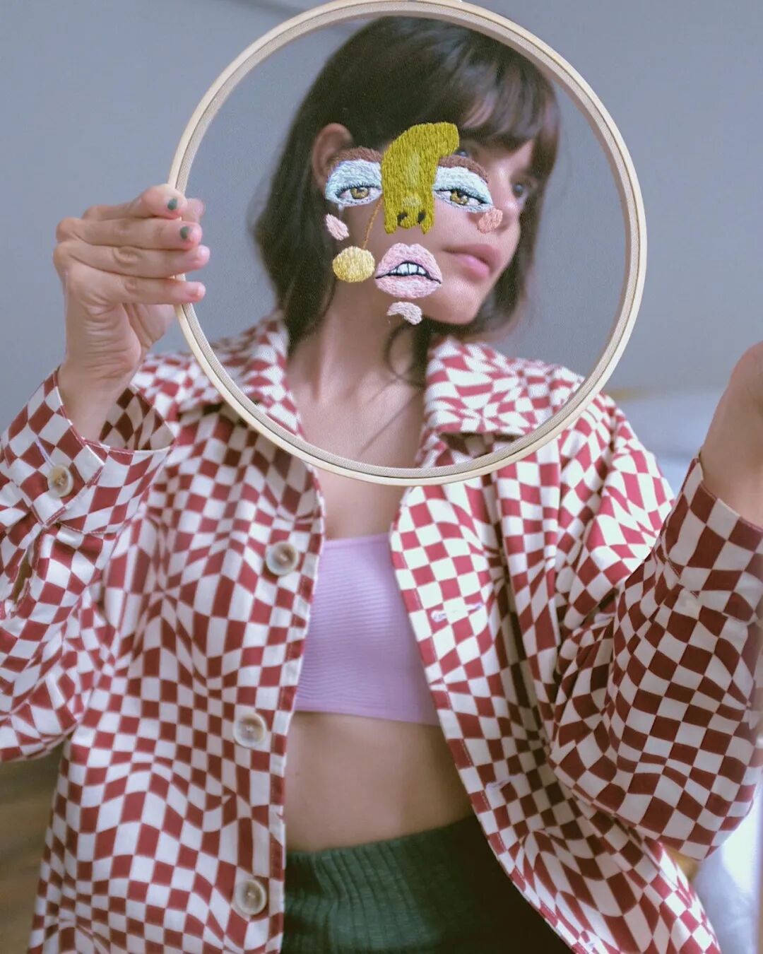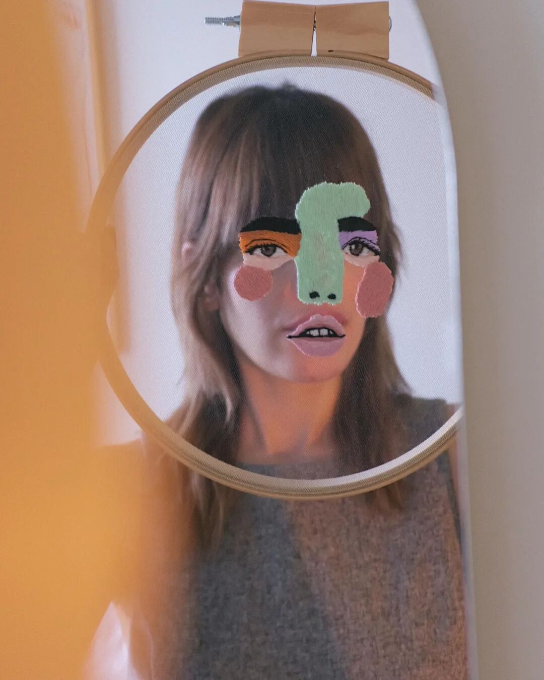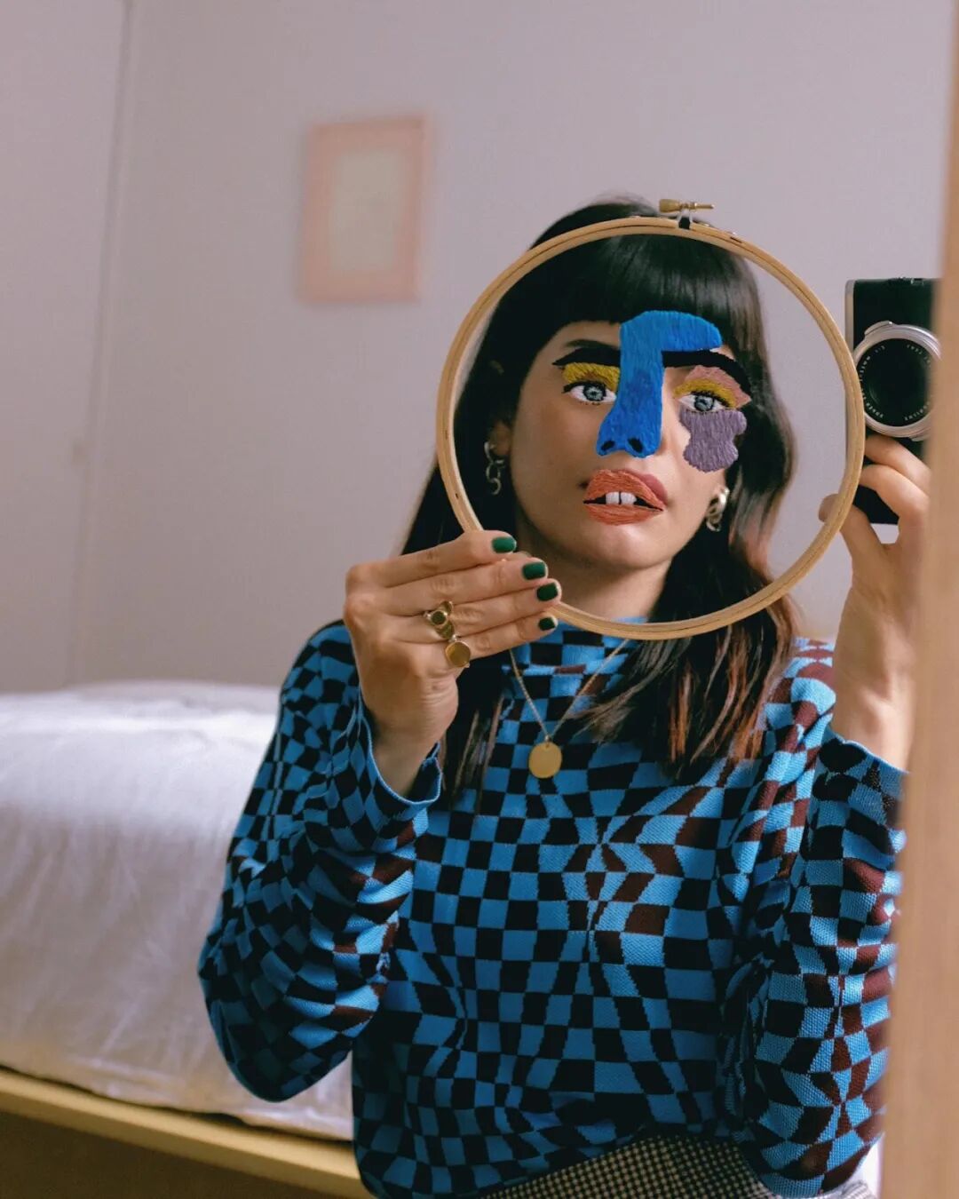 说了这么多,这位性格内向的艺术家展现自己的方式,其实是将这些刺绣出的抽象面孔,置于自己的面孔之前,然后拍摄下来,给人的感觉就好像,这些刺绣面孔就是艺术家本人。不得不说,埃琳娜·奥班多对比例的把握非常成熟,使用木箍构图她的肖像,并结合了大胆的色彩和简单的线条,从而营造出一种非常现代的感觉。