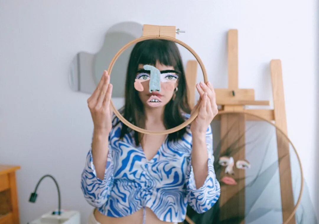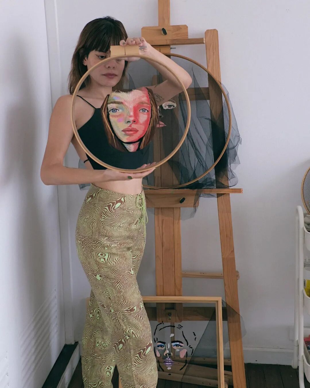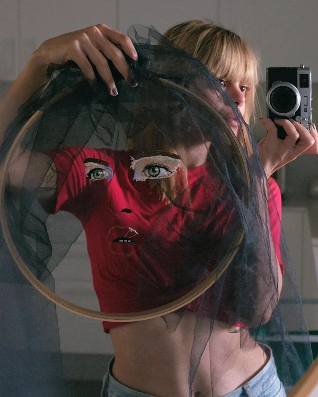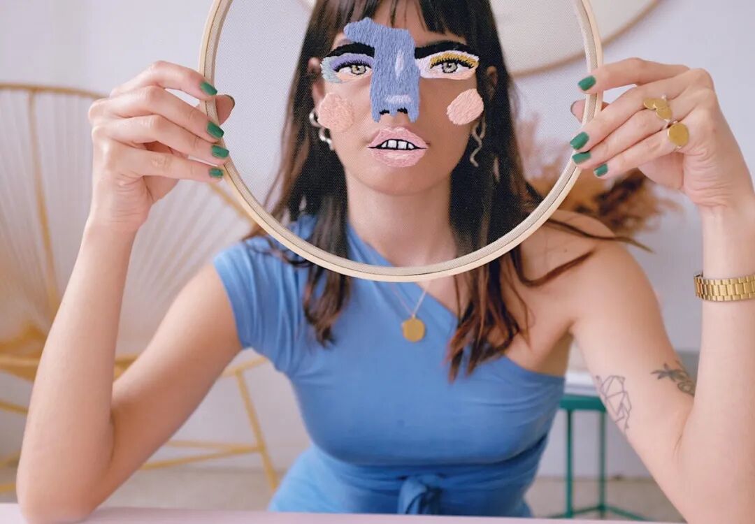 说了这么多,这位性格内向的艺术家展现自己的方式,其实是将这些刺绣出的抽象面孔,置于自己的面孔之前,然后拍摄下来,给人的感觉就好像,这些刺绣面孔就是艺术家本人。不得不说,埃琳娜·奥班多对比例的把握非常成熟,使用木箍构图她的肖像,并结合了大胆的色彩和简单的线条,从而营造出一种非常现代的感觉。