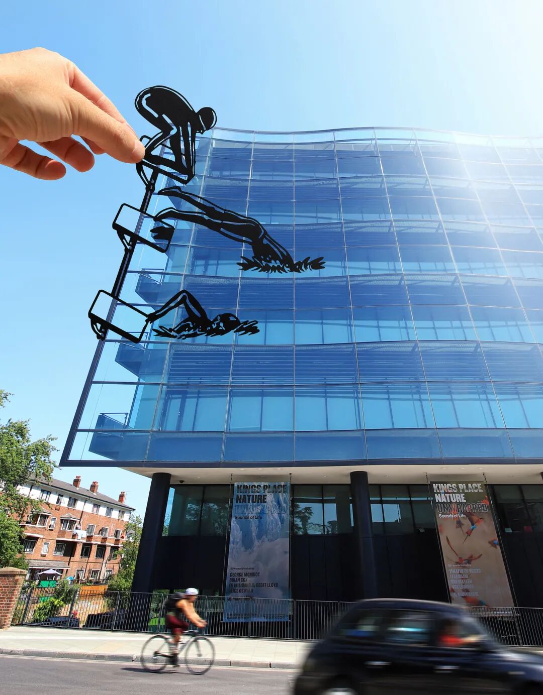 里奇·麦考尔用黑色的卡纸剪出各种人物的剪影,然后将这些剪影与我们熟悉的一些地标性建筑相结合,在特定的角度看去,它们融合之后形成了一个个全新的,充满趣味的场景,比如,凯旋门俏皮地变成了一个巨大的乐高人物;摄政街的倒置镜头变成了一条运河;国王广场的立面则充当了独立的泳道......