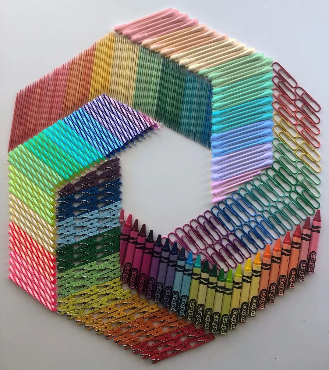 在亚当·希尔曼的世界里,数百根缝纫针可以变成一个有趣的迷宫,彩虹回形针可以组成一个六边形的图案,根据色调分组之后的乐高积木让人看了十分舒服。总之,亚当·希尔曼的作品是一定能够令“强迫症”都满意的,排列得整整齐齐,让人看完浑身舒爽。