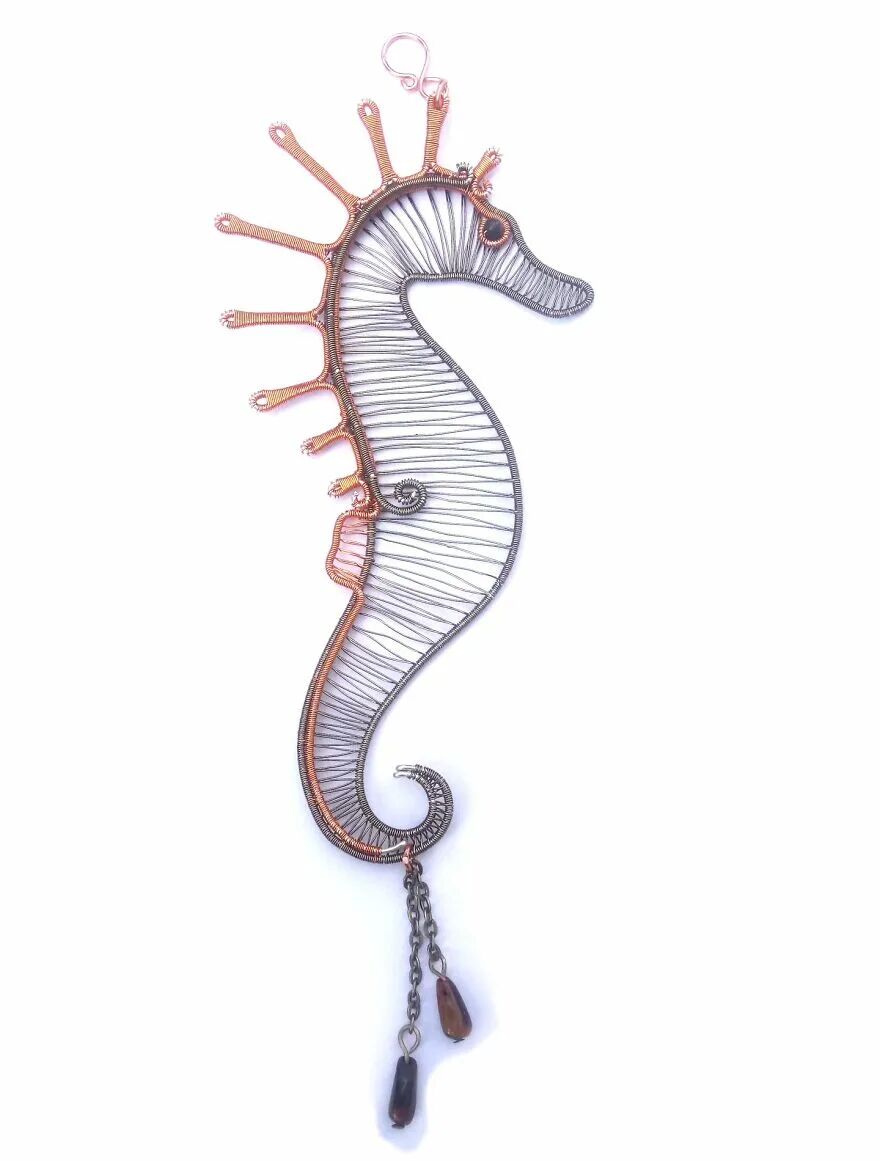 她的材料都不是新的,而是在各种地方回收而来的。除了电线,还有铁丝,旧电路板。通过一系列的弯折、缠绕和喷漆上色之后,一个个精致又不显廉价的手工艺术品就制作而成了,有项链、耳饰、胸针,还有壁挂,都是女孩子会喜欢的小玩意儿。