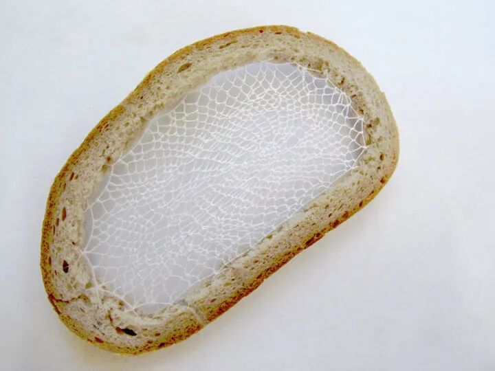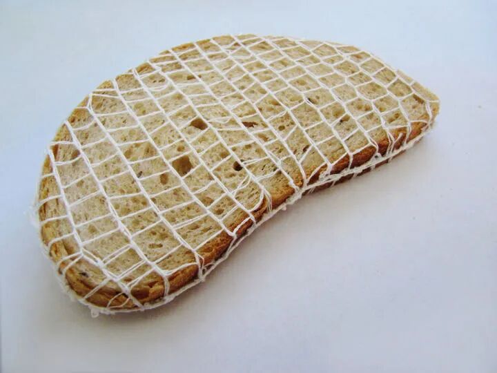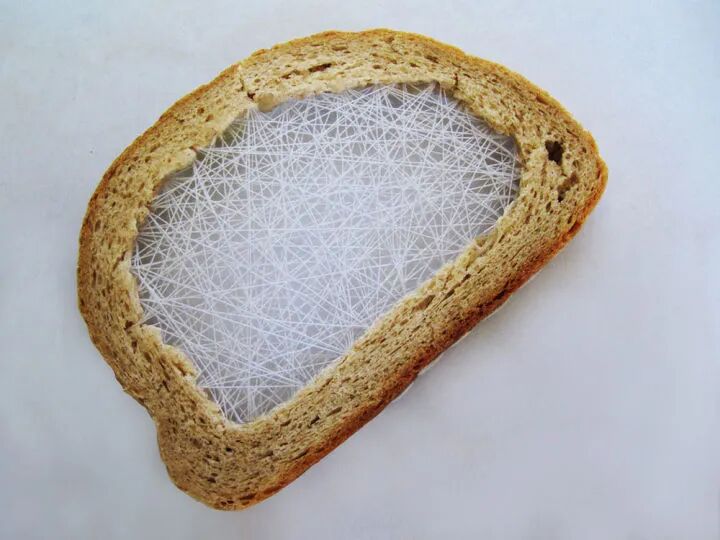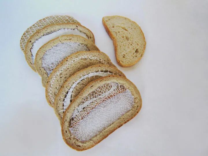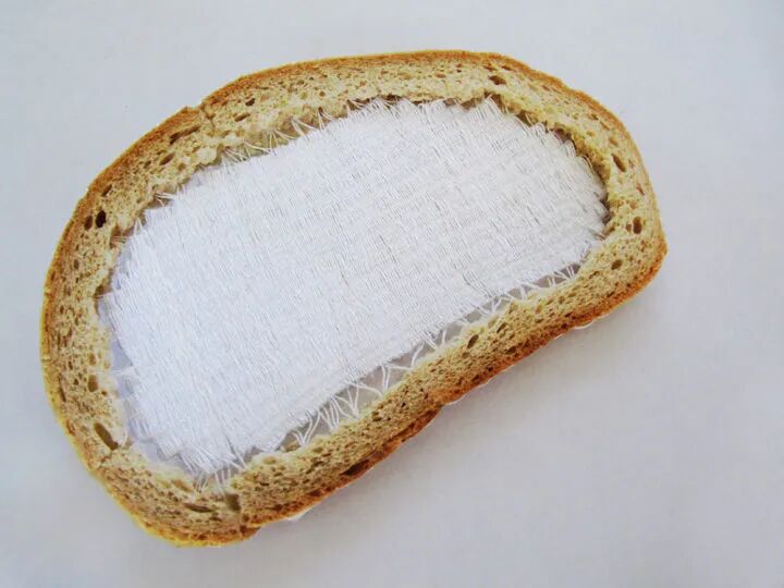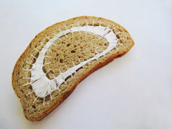 在切片面包上刺绣想也是一件费力不讨好的行为,狭窄的材料和不稳定的材质,让刺绣变得非常困难,虽然,特蕾齐娅·克尔纳科娃称她的作品是刺绣制作而成,不过,看起来更像是用线将面包片绑了起来。