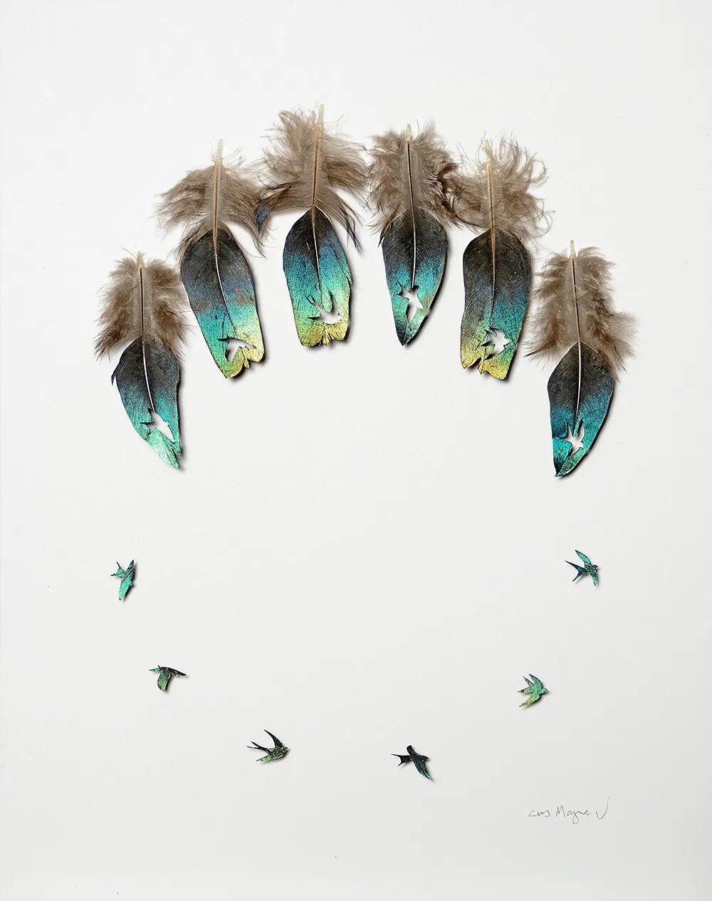 克里斯·梅纳德之所以给人留下来深刻的印象,这是因为他的作品实在非常特别,让人看到就很难忘记,不仅仅是他的作品精彩,更重要的是他使用的材料是各种鸟类的羽毛。
