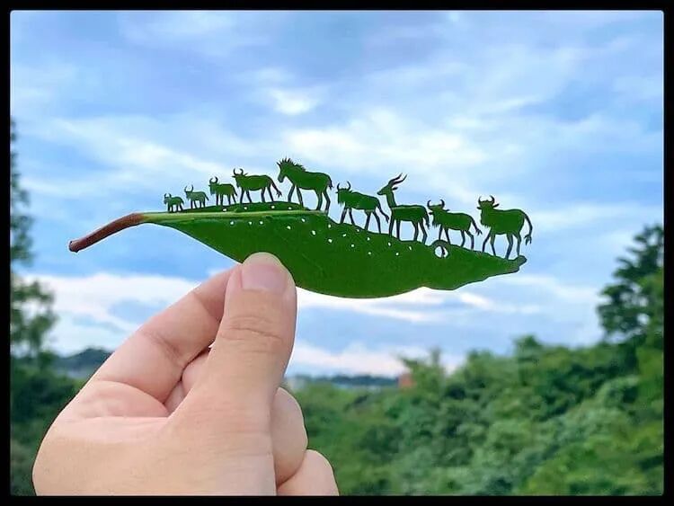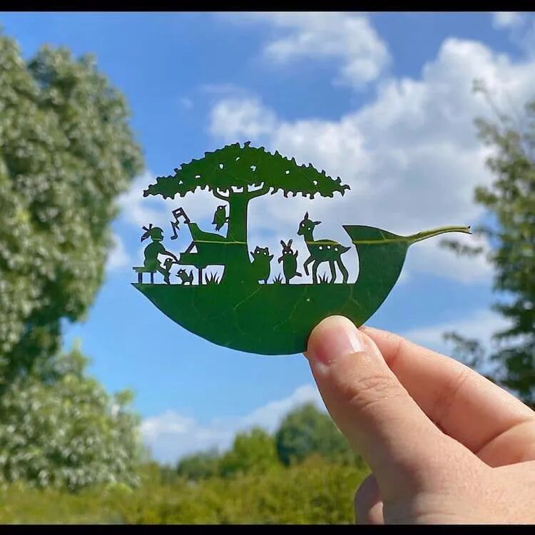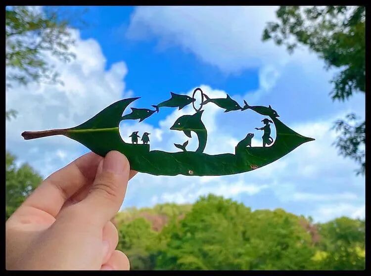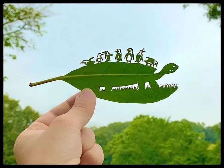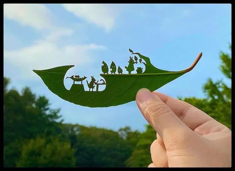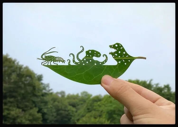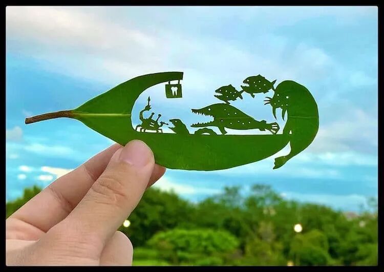 在日本,有一位名叫利托的叶雕艺术家,他用树叶制作而成的叶雕作品十分复杂,从他的叶雕作品中我们可以看到仿佛像是电影画面一般的场景,这些场景有水族馆、冒险乐园、恐龙世界等等。