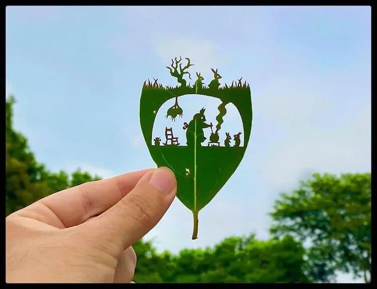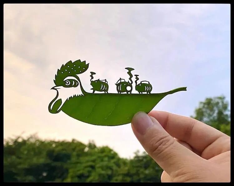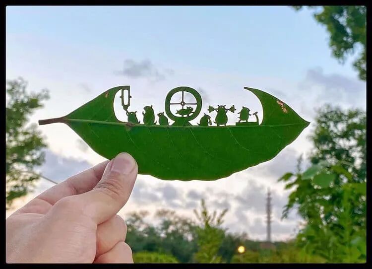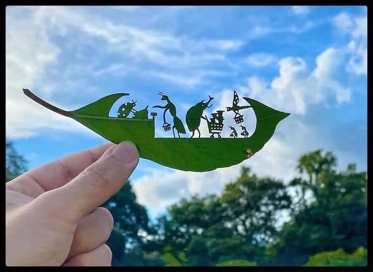 看到利托的叶雕作品,不免让人感叹,他是如何在这些小小的叶子上创作出这么复杂有趣的雕刻作品,我们可以从每一个叶雕作品中看到属于它们的故事,这样富有想象力的叶雕作品,让人怎么都看不腻。
