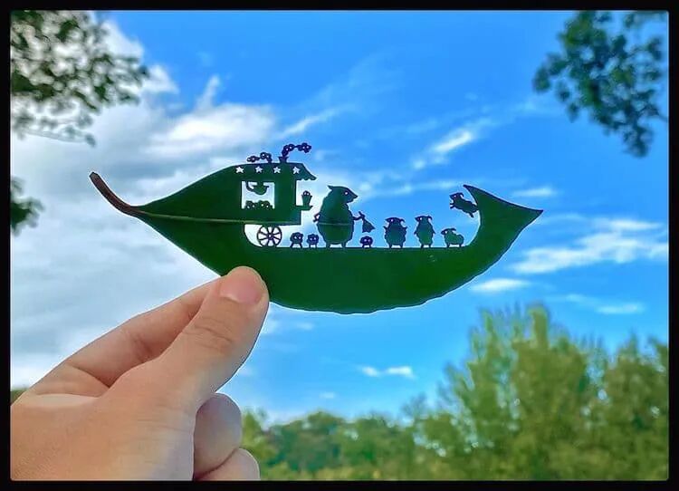 在80后,90后的童年中,树叶也是他们最好的玩具之一,相信很多人都将树叶折叠起来,挖掉两个圆形的洞和一个月牙形的洞,从而制作出一个“叶子面具”,事实上,这样的制作,就属于叶雕的一种,不过是相对简单的制作。