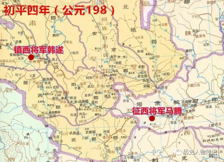 《三国志 卷三十六》:灵帝末与边章、韩遂等俱起事于西州。初平三年,遂、腾率众诣长安。汉朝以遂为镇西将军,遣还金城,腾为征西将军,遣屯郿。