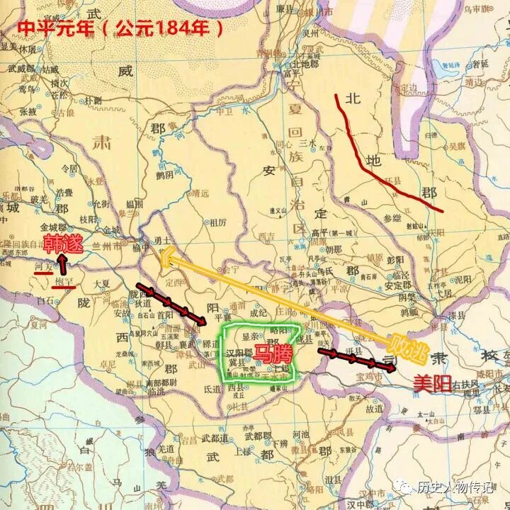 画横线的枹罕、河关以及北边的北地郡是叛乱发源地。北地郡的先零羌比较边缘化,没有影响汉人核心区域。枹罕、河关的盗贼汉羌混杂,也一直努力向汉人政权核心区进攻:他们先背上去金城郡劫持了韩遂,然后东进打到长安附近的美阳。被张温率领的董卓等人打败,退回榆中。在这一过程中,边章、韩遂从“被劫诱”而被迫参与叛乱,到后来真心叛乱,并成为叛军的实际领导者。到中平四年(187年)韩遂杀掉边章和最初叛乱的带头人,成为陇西叛军之主。这里我们可以注意到,韩遂在陇西的资历、声望远高于马腾。而马腾则大约是在184年-187年之间应征入伍。就像刘备应征入伍讨伐黄巾一样,马腾也是因为陇西地方州郡长官为了讨伐韩遂等人的叛乱而临时征召乡勇,才进入了官兵行列。这之后因为马腾“人长八尺馀,身体洪大,面鼻雄异,而性贤厚,人多敬之”,而且可能作战勇猛,成为了凉州刺史耿鄙的司马(相当于参谋长)。