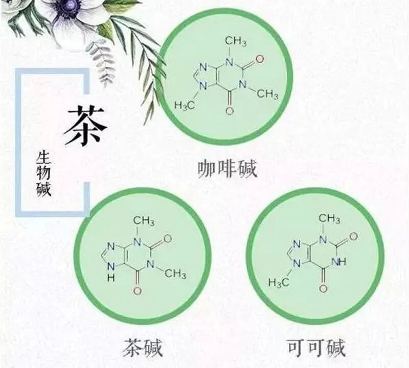 生物碱是一类含嘌呤环的嘌呤衍生物,茶叶中的生物碱主要是咖啡碱。茶叶中咖啡碱的含量在2%—5%之间,茶叶冲泡后,约有80%以上的咖啡碱能溶解于沸水中。咖啡碱对人具有兴奋和利尿的作用,故茶叶是一种良好的兴奋剂和利尿剂。