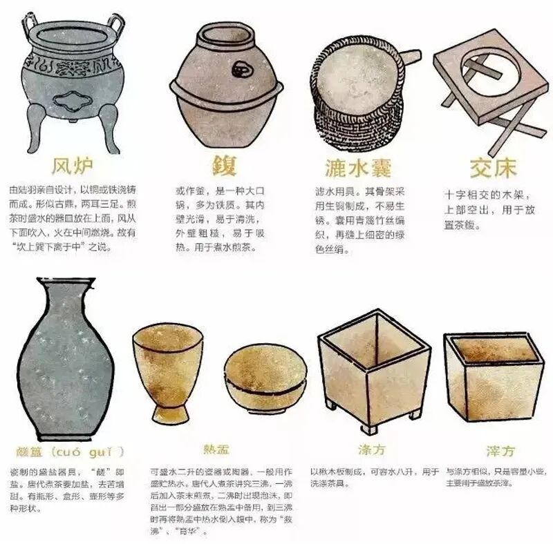 而他将这些调味料全都舍弃,只保留了盐来调味。先将饼茶碾成粉末,置于锅中煎煮,而后再加盐调味,以去除苦味,煎好的茶用长匙舀至面前的小茶碗中饮用。而煎茶又是非常讲究的,将茶放于茶鍑中煎煮,茶鍑架在交床上,风炉至于交床下加热茶鍑底部,从鹾簋中取适量盐中和茶的苦涩。