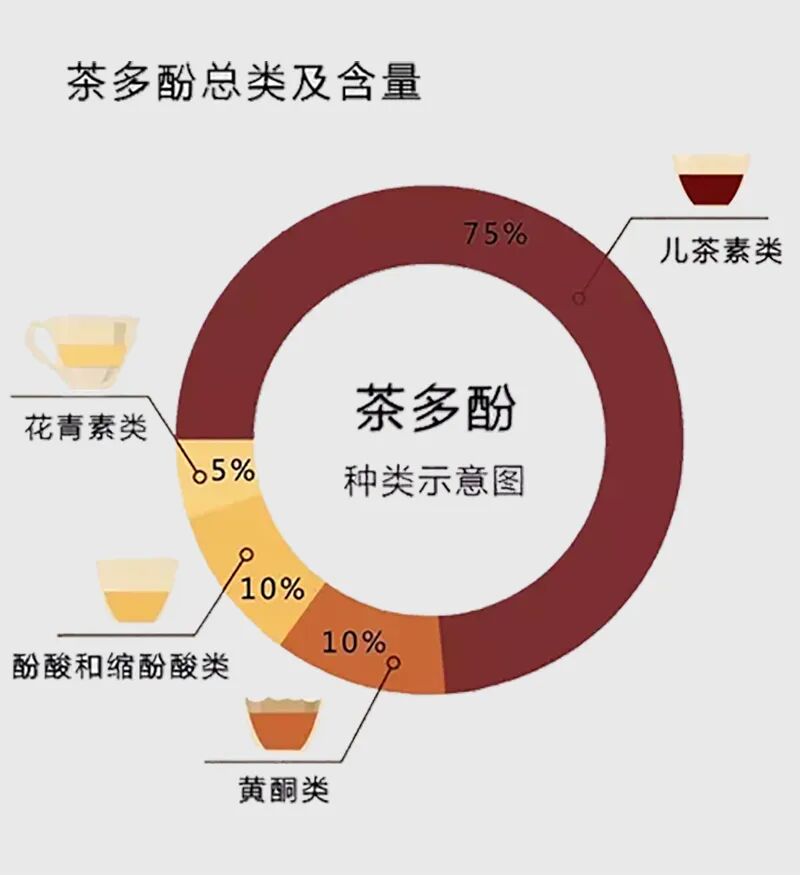 被健康及医学界誉为“辐射克星”的茶多酚,是茶叶中多酚类物质的总称,是茶叶中发现的主要化合物,也是茶叶可溶性物质中最多的一种,更是影响茶叶口味的最重要的物质之一。而酚类物质中又以儿茶素含量最高,其次为酚酸和缩酚酸类、黄酮类、花青素类。