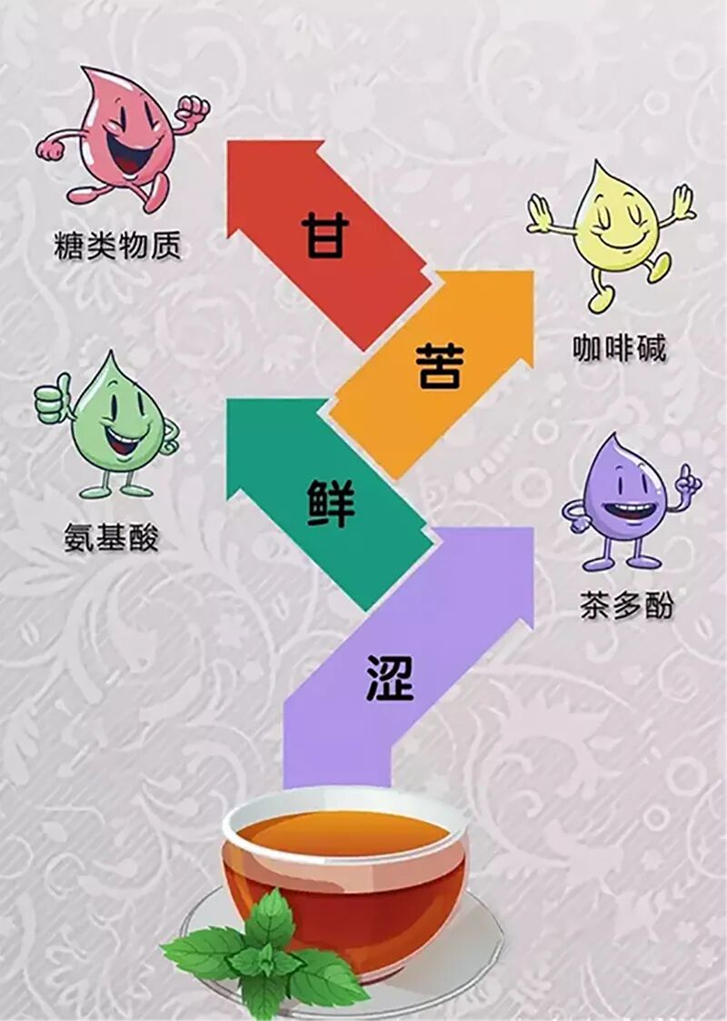 茶汤中的呈味物质归纳起来可分为:糖类、氨基酸、酚性物及其氧化产物(主要为茶多酚)、嘌呤碱(以咖啡碱为主)和茶皂素等。其中以茶多酚、氨基酸和咖啡碱对茶叶品质影响最大。而不同的茶叶品质含有以上物质含量不同,所以造就了茶叶口味的千变万化。换言之,就是茶叶的滋味是各种呈味物质对人的味觉器官协同作用的结果。因此各种呈味成分含量多少,彼此之间比例的改变都会影响茶汤滋味。