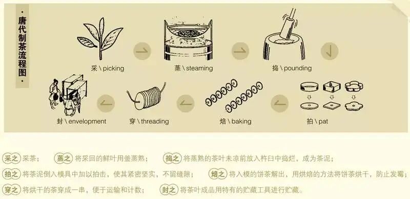 陆羽《茶经·三之造》记述:“晴采之。蒸之,捣之,拍之,焙之,穿之,封之,茶之干矣。”