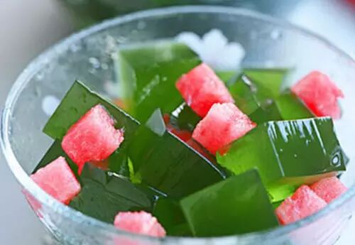 ⑩冷却后的抹茶凉粉用水果刀切成小块,吃时加入水果即可(放冰箱冷藏后风味更佳)。