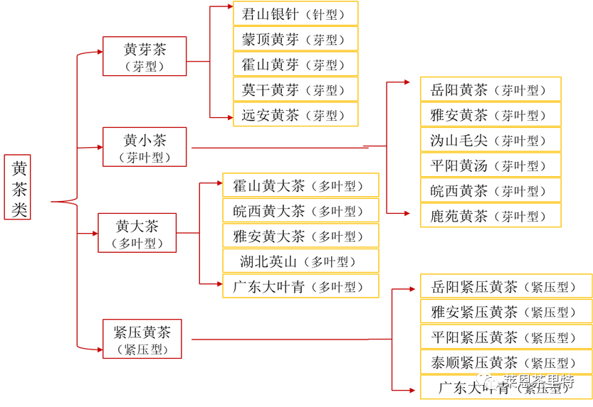 黄小茶 采摘细嫩芽叶加工而成,主要包括湖南岳阳的“北港毛尖”,湖南宁乡的“沩山毛尖”,湖北远安的“远安鹿苑”和浙江温州、平阳一带的“平阳黄汤”。黄大茶 采摘一芽二、三叶甚至一芽四、五叶为原料制作而成,主要包括安徽霍山的“霍山黄大茶”和广东韶关、肇庆、湛江等地的“广东大叶青”。
