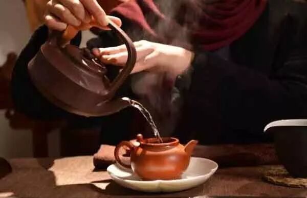 紫砂壶泡好茶后,在茶巾上沾干壶底的残水,并把茶水注入公道杯内,此过程就叫"游山玩水,慈母哺子"。