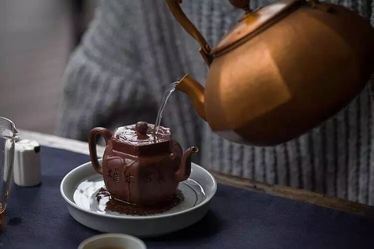 "重洗仙颜"是武夷九曲溪畔的焉得虎子,摩崖石刻的喻意,在这里喻出。第二次冲泡完时加上壶盖后,还要用开水洗烫壶的表面,内外加温,有利于茶香的散发。