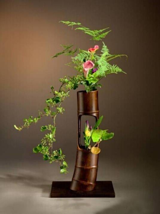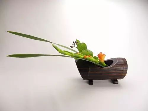 倾斜式:指以第一主枝倾斜于花器一侧为标志的插花,表现植物受风雨吹打、压弯的技条重新向上生长的自然状态。
