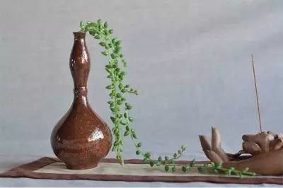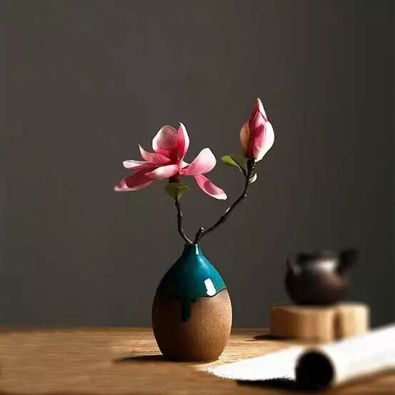 茶艺插花的花器,以造型简约、古朴为上,瓶高和盆宽可以用手掌的一跨左右来衡量。