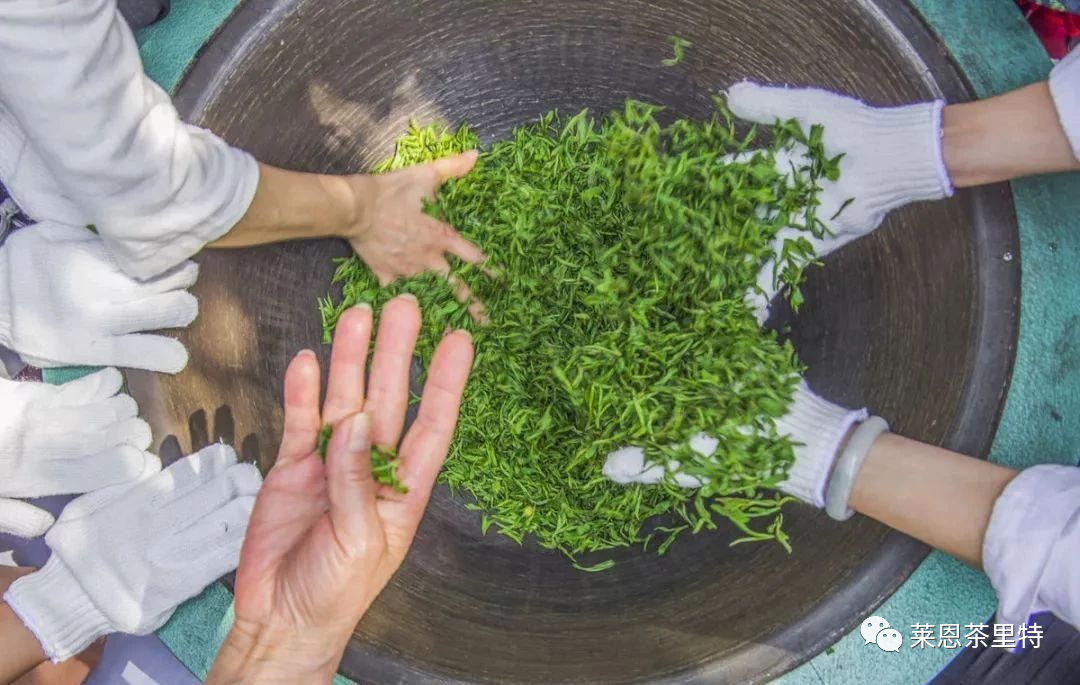 炒茶分生锅、二青锅、熟锅三锅连续操作。生锅主要起杀青作用,破坏酶的活性;二青锅主要起初步揉条和继续杀青的作用;熟锅主要是进一步做条。炒茶锅都采用普通饭锅,按倾斜25。~30。砌成相连的三口锅炒茶灶。炒茶都使用竹丝扎成的炒茶扫把,长约1米,竹丝一端分散直径约为10厘米。所不同的是炒法,当地茶农总结为“生锅要旋,二锅带劲,熟锅要钻”,另外锅温也有所不同。生锅锅温为180℃~200℃,投叶250~500克,两手支起炒茶扫把在锅中旋转炒拌,使叶子随着扫把旋转翻动,受热均匀,此即“满锅旋”。同时注意旋转要快,用力要匀,并不断翻转抖扬,散发水蒸气。炒3~5分钟,叶质柔软、叶色暗绿时,可扫入二青锅内继续炒制。二青锅锅温略低于生锅。进入二青锅后,及时用炒茶扫把将叶子困住在锅中旋转,转圈要大,用力也较生锅大,即“带把劲”,使叶子顺着炒把转,而不能赶着叶子转,否则满锅飞,起不到揉捻作用。然后再加上炒揉,用力逐渐加大,做紧条形,通过多次炒揉,当叶片皱缩成条、茶叶黏着叶面、有黏手感时,可扫人熟锅继续做形。熟锅温度更低,为130℃~150℃,炒茶方法基本同二青锅。所不同的是增加了旋转搓揉,使叶子吞吐于竹丝扫把问,即“钻把子”。如此炒揉、搓揉连续不断进行,待炒到条索紧细、发出茶香、达三四成干时,便可出锅,进行初烘。