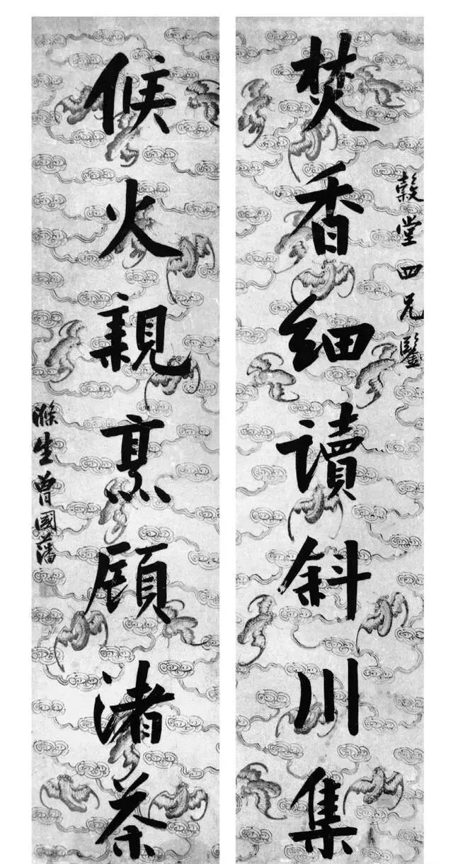 曾国藩此书联“焚香细读斜川集,候火亲烹顾渚茶”,用笔含蓄储势,线条简洁质朴,结字端庄典雅,态闲神逸,沉稳而灵动,刚毅敦实之致流露楮墨,呈现出一代名将大儒的气派。联文抒发焚香读书、烹茶品茗的趣味。《斜川集》是苏轼幼子苏过的诗文集,晚年的苏轼一直是由苏过悉心照料的。“顾渚茶”是唐代的官焙贡茶。“候火亲烹”是指古人乐于亲自感受烹茶过程,如罗廪《茶解》句“至水火相战,俨听松涛,倾泻入瓯,云光缥缈,一段幽趣”。联取陆游《斋中弄笔偶书示子聿》诗颌联。