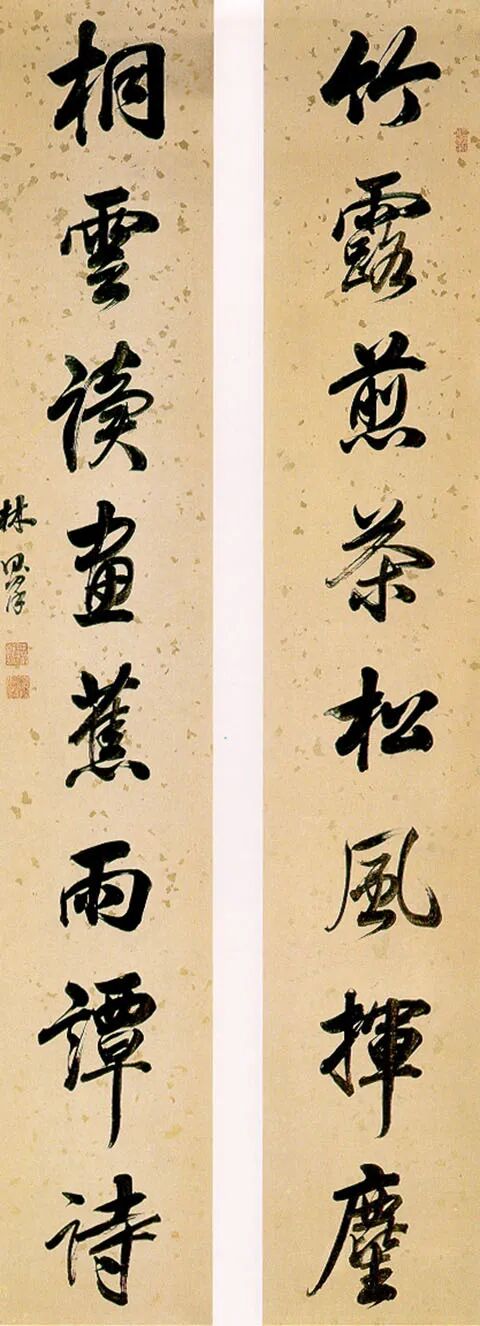 林则徐行书联“竹露煎茶松风挥麈,桐云读画蕉雨谭诗”,笔法灵活,笔画遒健。晋人清谈时,常挥动麈尾以助谈,后以“挥麈”表示谈论。此联品茗论道、谈诗读画,在芭蕉梧桐下,在翠竹青松里,在风云雨露的四季变化中, 意趣隽永。