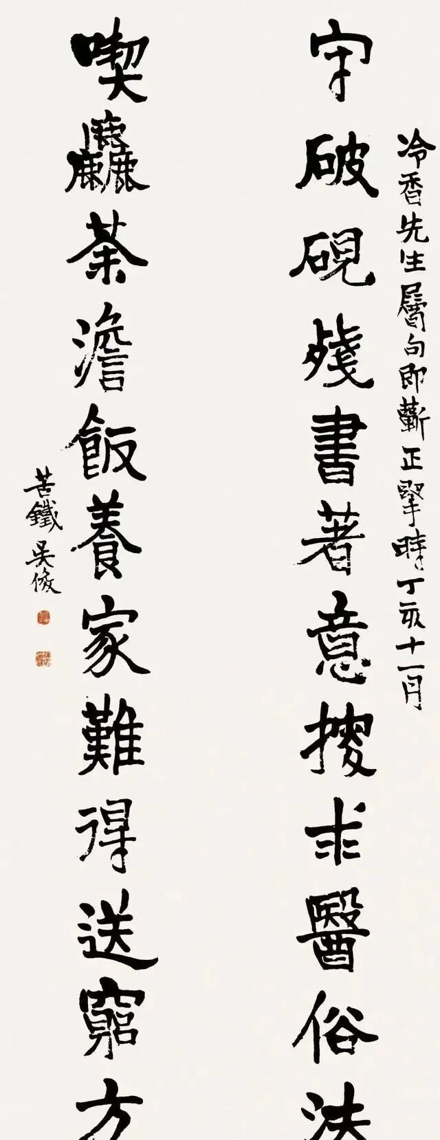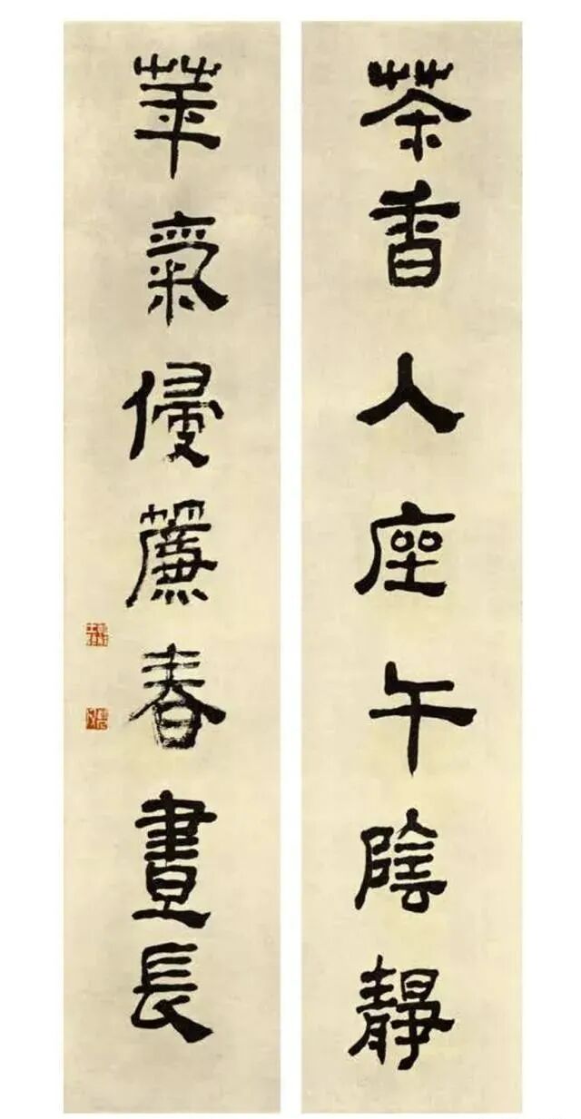 吴昌硕楷书十二言联“守破砚残书著意搜求医俗法,吃粗茶淡饭养家难得送穷方”是一副不可多得的吴昌硕楷书作品,联文与书法完美地结为一体。从吴昌硕存世的书作来看,石鼓、行草等创作得较多,而带有北碑风格的楷书极为罕见,此作可以说是其代表作之一。作品笔力遒劲,气息深厚,沉着率真,运笔方圆并用,隶楷相兼,结体古雅,奇拙中内涵蕴藉,古朴处萧散舒展。联文展现粗茶淡饭、安贫乐道的颜回境界,学而不倦,笔耕不辍,追求不俗的人生。