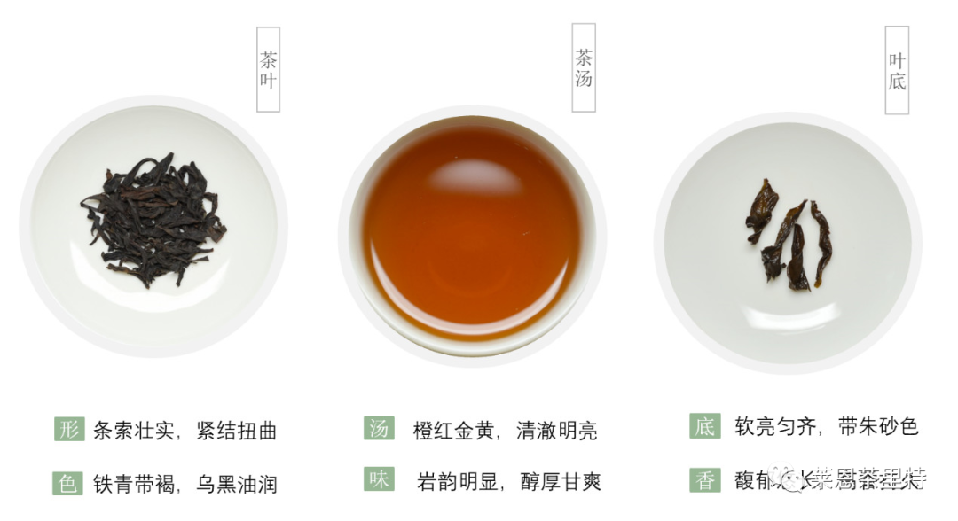 外形弯条型,色泽乌褐或带墨绿、或带沙绿、或带青褐、或带宝色。条索紧结、或细紧或壮结,汤色橙黄至金黄、清澈明亮。香气带花、果香型,瑞则浓长、清则幽远,或似水蜜桃香、兰花香、桂花香、乳香等等。滋味醇厚滑润甘爽,带特有的“岩韵”。叶底软亮、呈绿叶红镶边、或叶缘红点泛现。