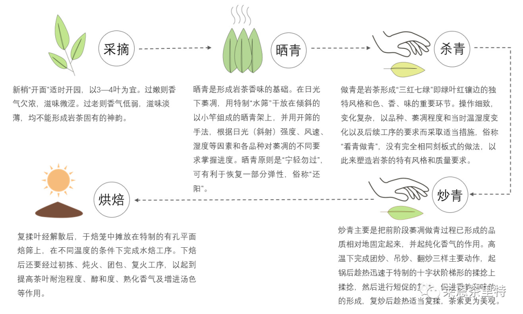 武夷岩茶的制作工艺属乌龙茶制作,区别于台湾乌龙茶追求鲜爽的轻发酵轻焙火、安溪乌龙茶追求花香的深发酵低焙火,采用深发酵重焙火做法。