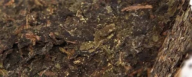 金花的形态是一颗颗的,零零散散地分布在茶砖上,不存在霉丝。在茶叶里比较牢固,不能轻易擦掉;而黄曲霉与白霉成片状共生,有黄曲霉必有霉丝,它们更容易吹走。作为有益菌的金花,与所谓的发霉,是不可混为一谈的。