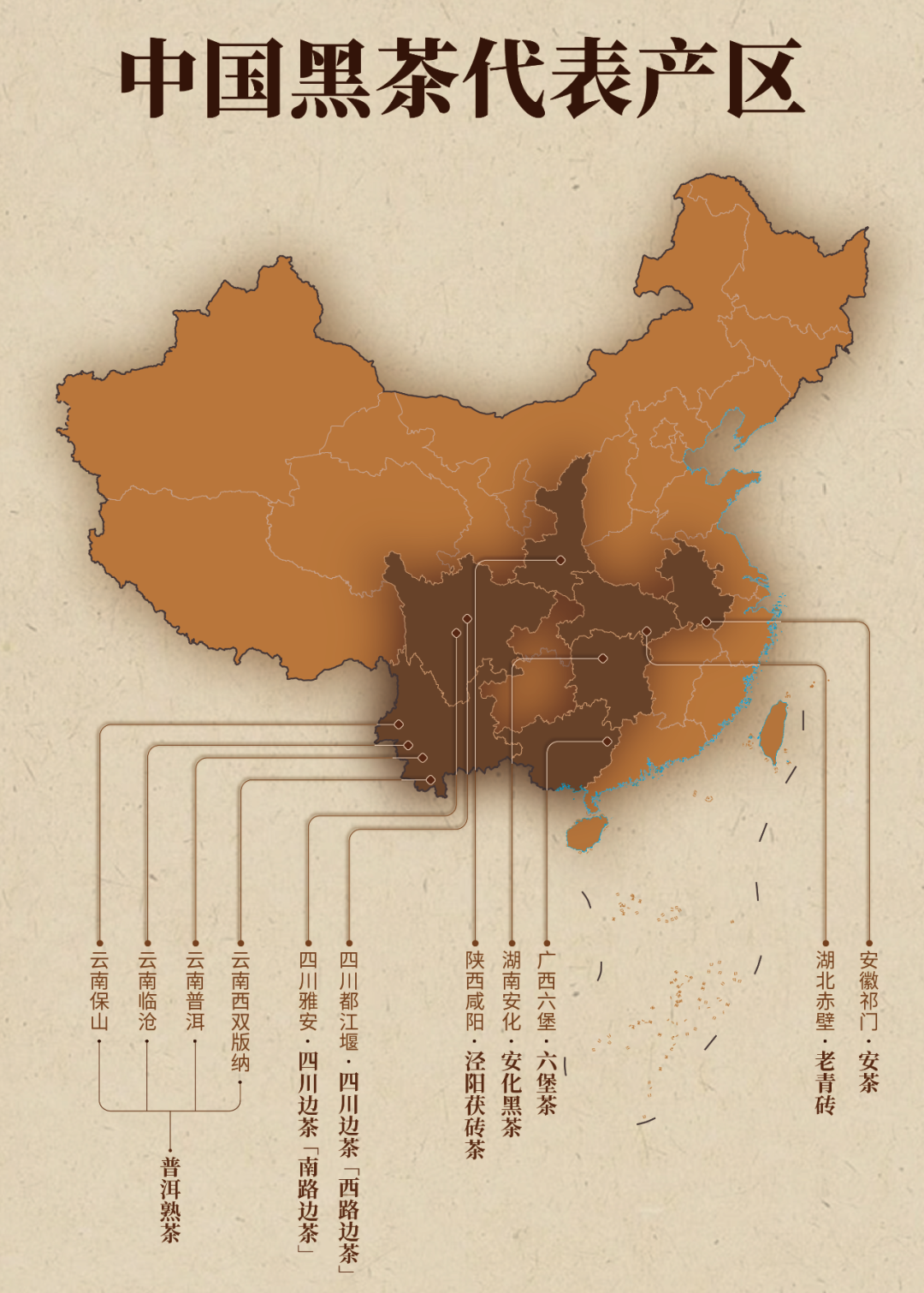 黑茶在历史上多以边销与外销为主,因此产黑茶的地区一直比较固定,现今产量比较大的主要有湖南、湖北、四川、广西、云南等五大产区,同时陕西、安徽等地也有代表黑茶生产。