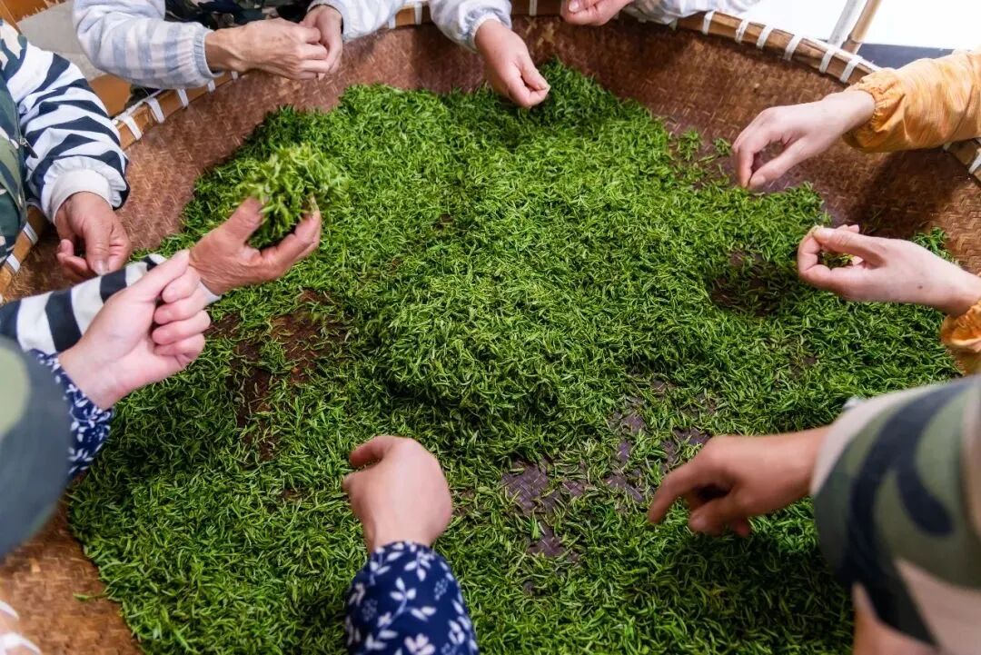 太湖翠竹用一芽一叶初展的嫩芽为原料,再经过摊放、萎凋、杀青、整形、烘干和辉炒、提香等工艺流程,每炒制500克成品需要3万余个嫩芽。