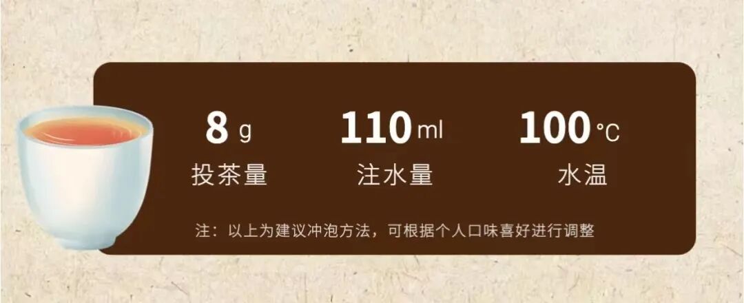 第一至三泡,注水后,浸泡时间5秒即可出汤,注意每泡均沥干茶汤第三泡以后每泡出汤时间增加5秒。