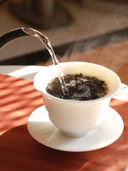 以环壁注水的方式注入沸水,环壁注水可让盖碗中的肉桂茶条索均匀的浸润在沸水中。