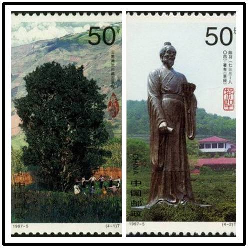 1997年,原国家邮电部发行《茶》特种邮票一套四枚,第一枚为“茶树”,邮票上的这株茶树就是位于云南澜沧拉祜族自治县富东乡邦崴村,它高11.8米,树围约9米,树龄已逾千年,充分证明了“茶树原产于中国”“饮茶源于中国”这一论点;第二枚“茶圣”,主图是竖立于杭州中国茶叶博物馆院内的陆羽铜像,唐代陆羽著有世界上第一部茶书《茶经》,被后人尊称为“茶圣”;第三枚“茶器”,是陕西法门寺出土的唐僖宗供奉的镏金银茶碾等茶具;第四枚“茶会”,是明代画家文征明创作的《惠山茶会图》(局部)。茶会是我国古代文人雅会的常见形式,也是诗人吟咏、画家作画的重要题材,表现了他们以茶会友、亲和礼让,以及追求自然清静、返璞归真的境界。