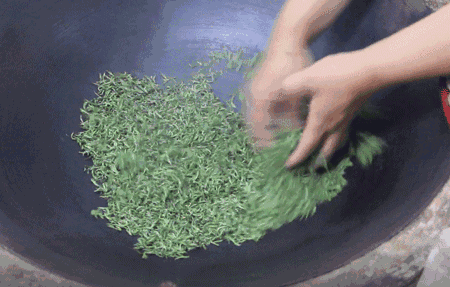 锅温180℃左右,投入摊青叶100克左右,炒12分钟后,将锅温降至100℃左右。当叶质柔软,折梗不断,清香显露,即起锅揉捻。历时45分钟。