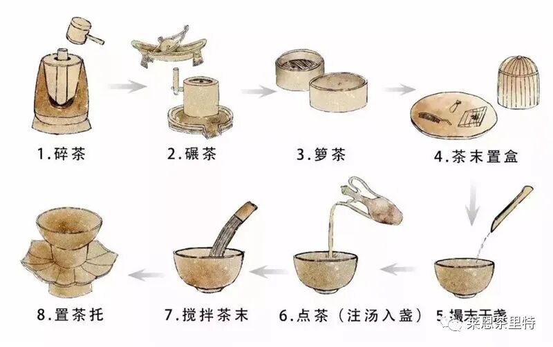 简译:茶碾银制的最好,其次是熟铁的。而没有经过挑选打磨的生铁制成的茶碾,有时有黑屑藏在缝隙、凹处,会严重影响茶的色泽。碾槽要制作得深峻,碾轮要税利而薄。槽深峻,那么槽底就平直,碾茶时,茶叶容易聚集在槽底,碾出的茶末就粗细均匀。茶筛的底面要细密,筛底要绷得紧,这样做筛底的绢才不易被堵死而容易透气。碾茶一定要有力、快速,碾的时间不能太久,否则,碾铁会损害茶的色泽。筛茶用力一定要轻,持筛要平稳,不要怕筛的次数多,只求不损耗茶末。只有经两次罗筛的茶末,加入水才会轻盈泛起,茶面如粥面般凝结有光泽。