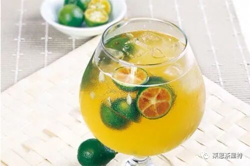 配料:5个绿色金橘,2茶匙绿茶,适量蜂蜜和适量冰块。