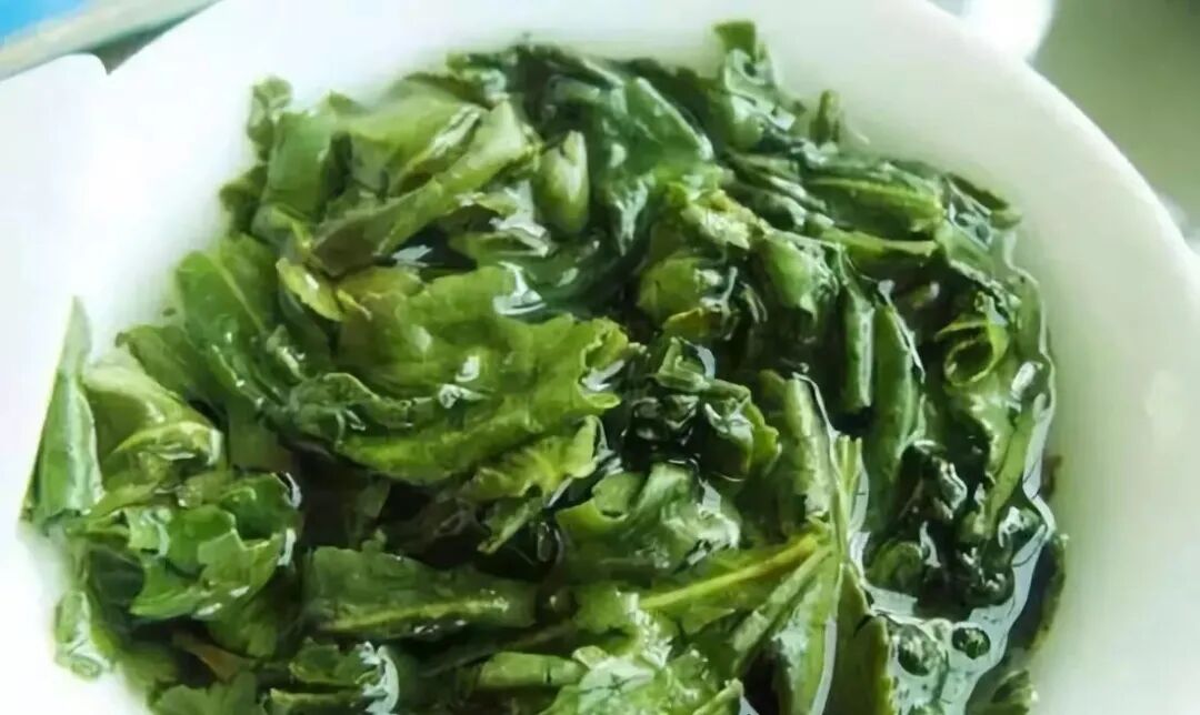 (4)观叶底:经沸水冲泡过的茶叶(称为“叶底”,俗称“茶渣”),倒入盛有清水的盘中,观察叶底。凡叶底柔阮、黄亮、“青蒂绿腹红镶边”明显的,均为上品。
