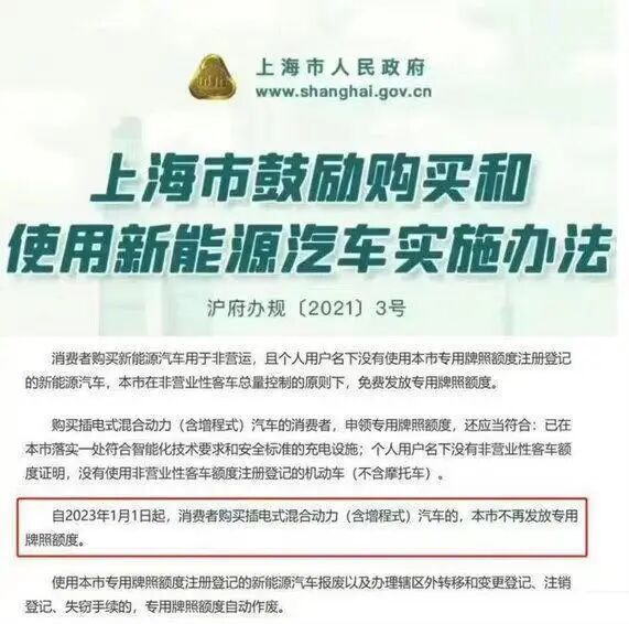 这就意味着,2023年起上海消费者购买插电混动和增程式混动车,既不能享受补贴,也必须得和传统燃油车一样,拍牌了。