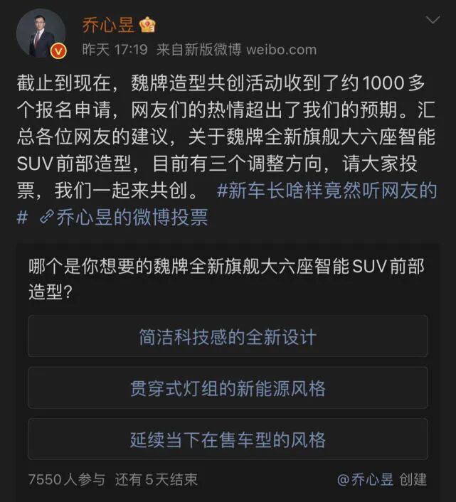 魏牌CMO乔心昱更是在网上发起了投票,征求广大网友对于新车设计的建议。