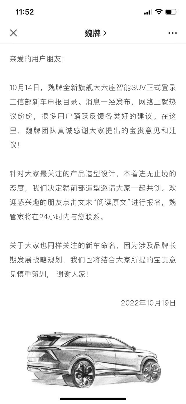 魏牌官方称,真诚感谢网友的宝贵意见和建议。针对产品造型设计,决定邀请大家一起共创。
