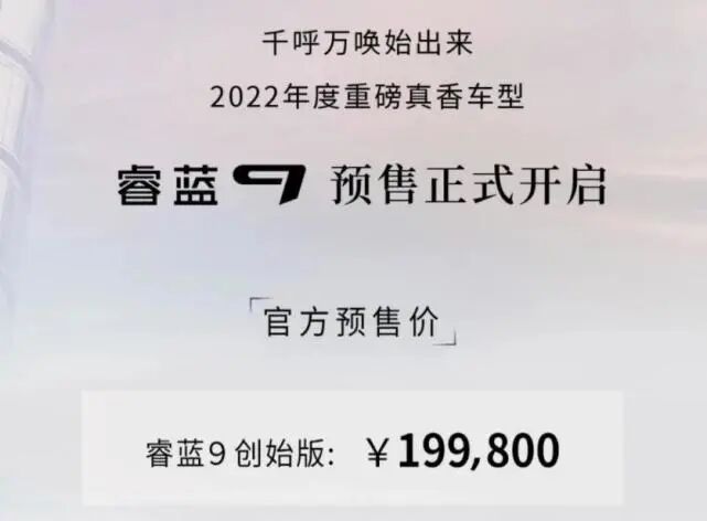 新车定位是中型纯电动SUV,此次预售的车型是睿蓝9创始版,预售价为19.98万元,主打换电模式。