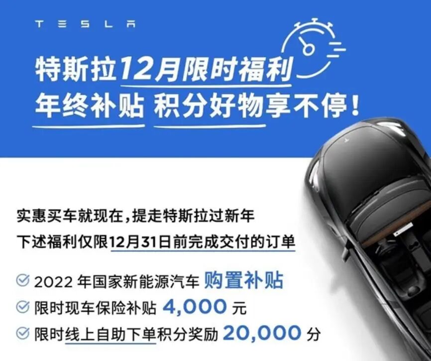 12月3日,特斯拉又发布消息,购车不仅可以享受4000元保险补贴,限时线上自助下单还可以奖励2万元积分。