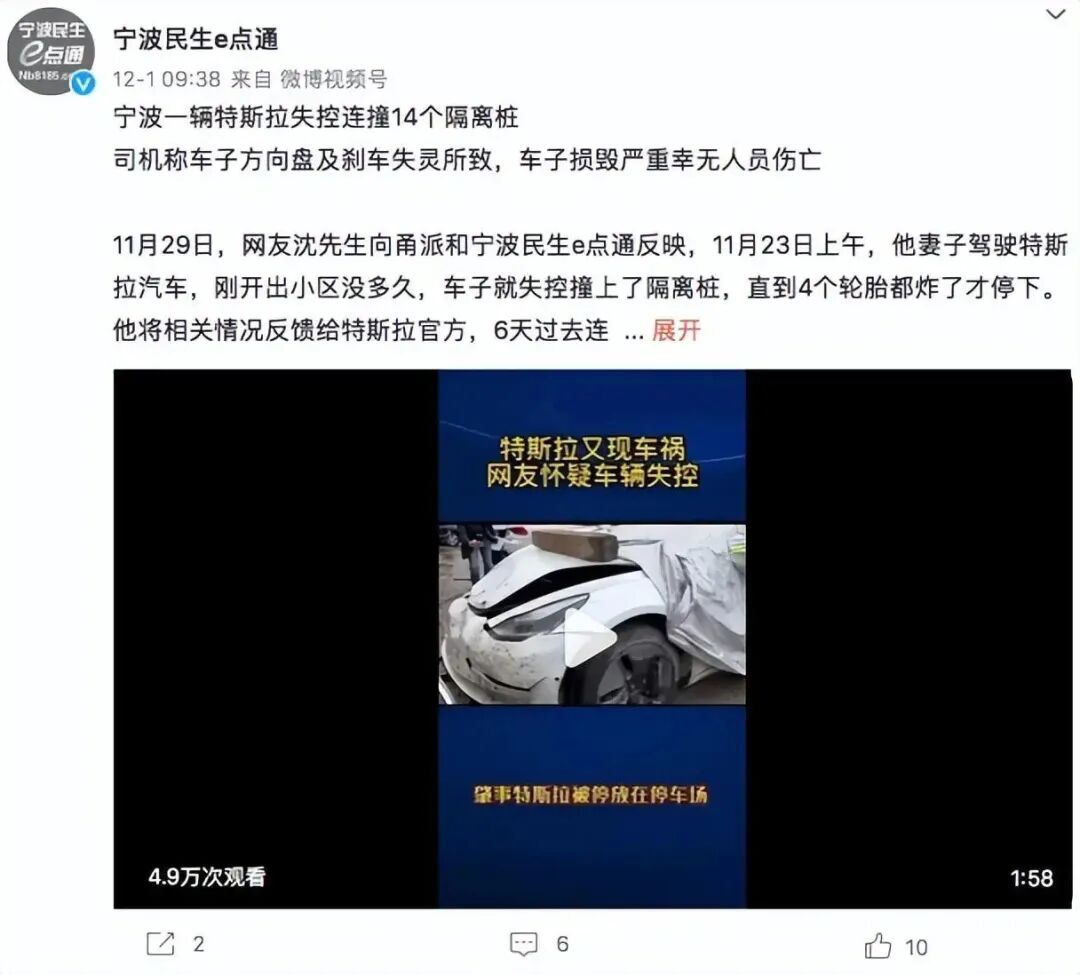 还有就是新能源车的失控事件,尤其是在特斯拉、蔚来等车型上,出现的几率也比较高。