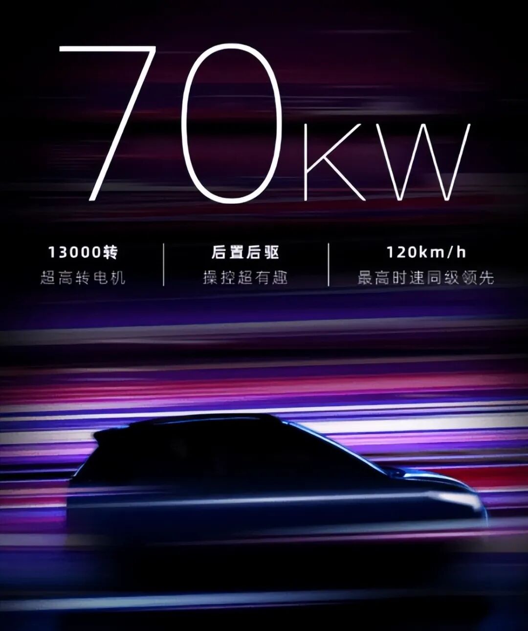 新车搭载了最大功率为70千瓦的电机,采用了后置后驱的驱动方式,最高转速可达13000转/分,最高时速为120公里/小时。