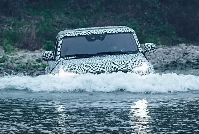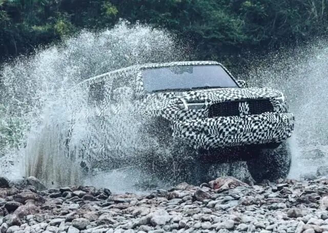 量产后车顶还将会配备有行李架和扶梯,十字造型的尾灯设计风格非常独特,还配备有外挂备胎,车身长度据说会超过5.2米。