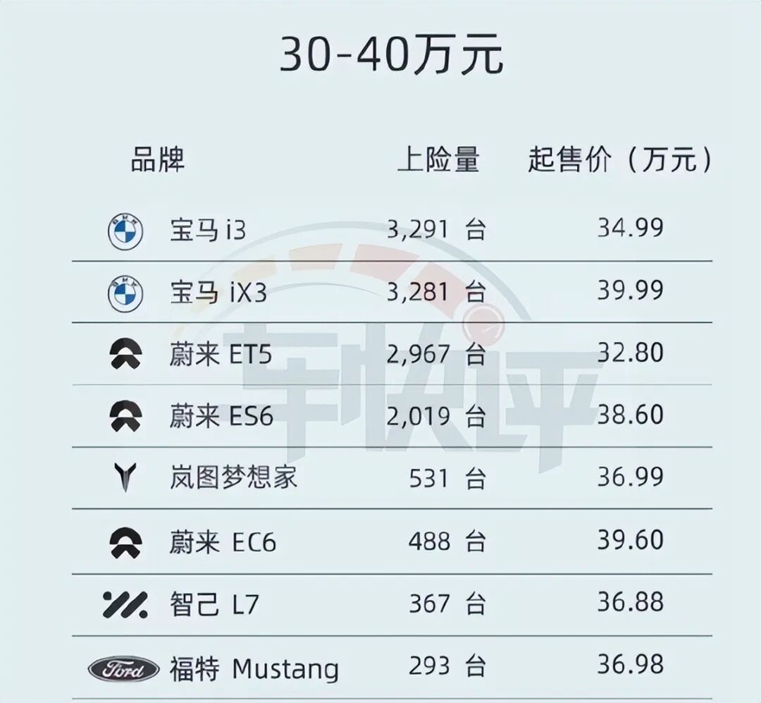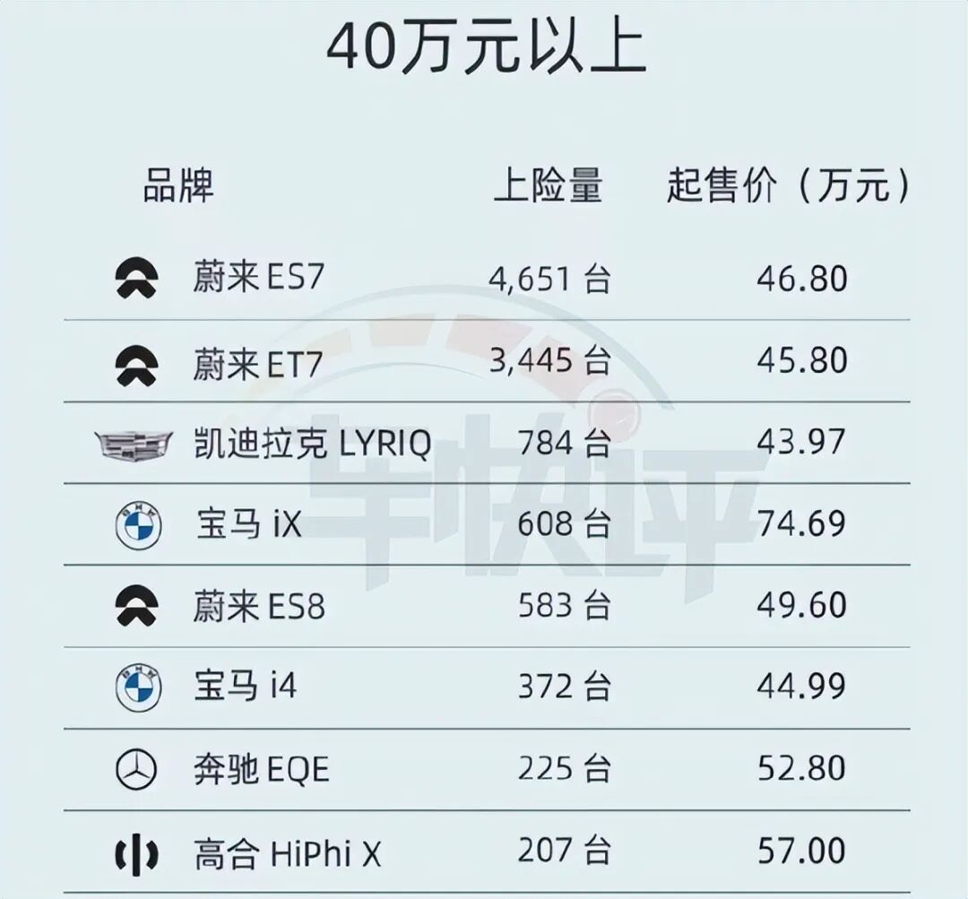 40万以上售价区间,虽然有多款德系豪华电动车入围,但销量相比蔚来汽车差距非常之大。